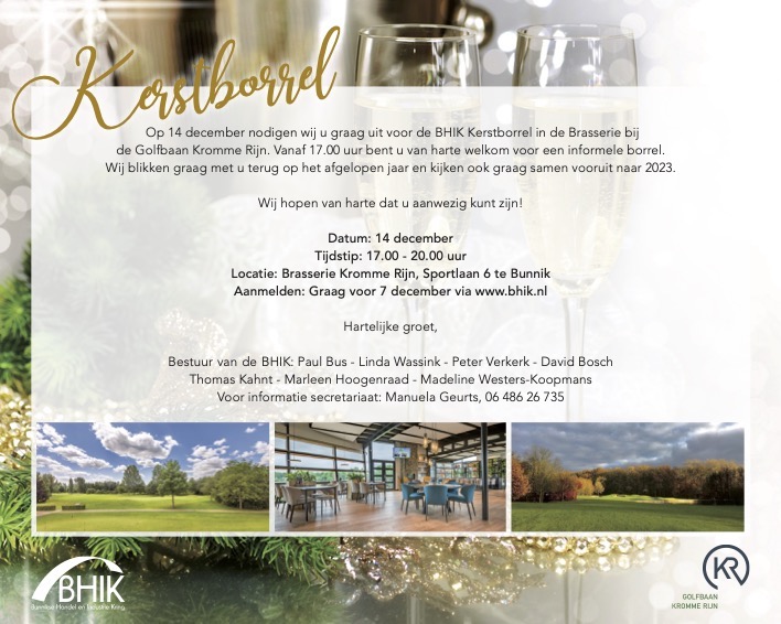 Op 14 december bent u van harte welkom bij de Kerstborrel van de BHIK. Aanmelden kan tot 7 december via onderstaand formulier.