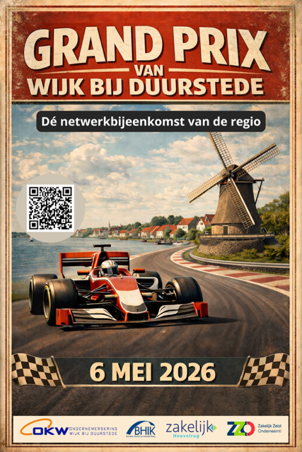 Graag nodigen we je uit voor het Regionaal Netwerk Event 2026: De Grand Prix van Wijk bij Duurstede, op woensdag 6 mei. Dit is dé kans om in één middag en avond je netwerk flink uit te breiden en nieuwe samenwerkingen te ontdekken.